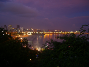 Mumbai by night is referred to as “The Queen’s Necklace.” The route was virtually the same as “Panoramic Mumbai” which we had just taken. The difference was the lights of the city and the water after dark. The description mentioned “a favorite promenade for locals” and I found this to be true. There was a long strand of beach with a wall that reminded me of how people gather at Mission Beach at sunset. I found it somehow gratifying to know that at the end of the day people enjoyed gathering at the water’s edge.