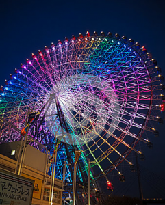 th gondola was completely transparent. Mary and I wanted to appreciate the lights of Osaka at night. The cost of a ride was only $7.00 worth of ‘yen’ whether you selected an opaque or transparent gondola. Apparently, transparent gondola rides are popular. The cost was the same, but we had to wait 45 minutes to board a transparent gondola. I snapped a few pictures but they did not capture the experience. Nonetheless, the wait was worth it. This around the world cruise continues to be a delightful experience.
