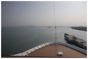 I have learned on this world tour that no two piers are alike. While “Klang” does not sound pleasant, I found the place we docked at Port Klang rather pleasing. There was a long wooden elevated walkway connecting us to a large quaint building. The walkway was shaded with a roof matching the one on the building.